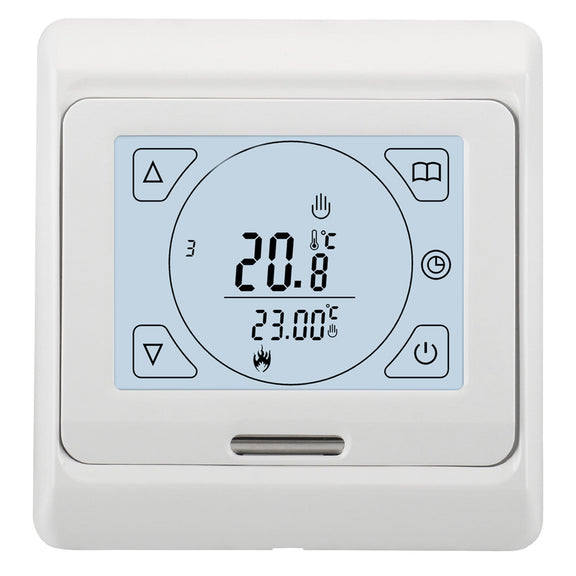 Heschen Wochenzirkulation digital programmierbarer Thermostat mit LCD-Touchscreen verfügt über 6 Ereignisse pro Tag, bietet eine energiesparende und komfortable Wohnumgebung, ist einfach zu installieren und bequem zu bedienen. Manueller Modus und Programmiermodus können ausgewählt werden. Hintergrundbeleuchtung für einfache Anzeige. Der Thermostat wird zur Steuerung von elektrischen Heizgeräten oder Ein/Aus-Ventilantrieben verwendet, die in der wassergeführten Fußbodenheizung eingesetzt werden. Geeignet für fast alle elektrischen Fußbodenheizungssysteme. Passt in Standard-Elektro-Unterputzdosen.